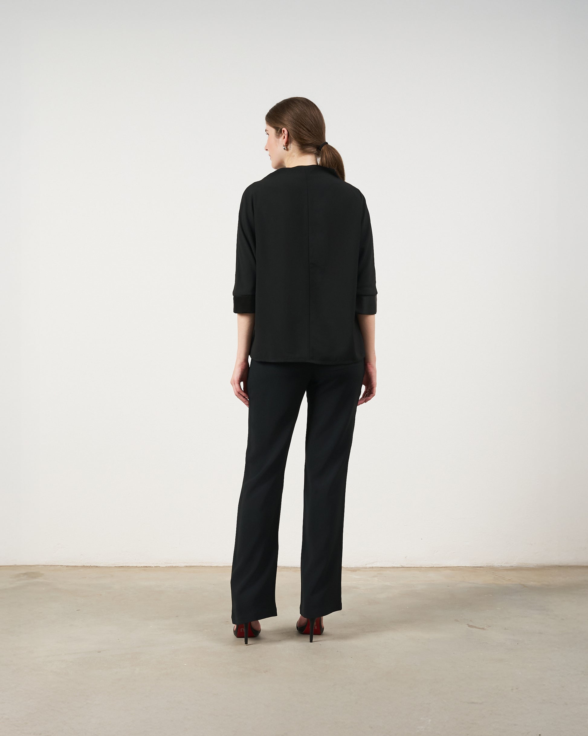 A Blusa Gal confeccionada em tecido de crepe possui gola com fechamento por zíper, manga 3/4 e modelagem ampla. A barra da manga é aplicada no lado brilho do tecido, detalhando a peça de forma sutil.