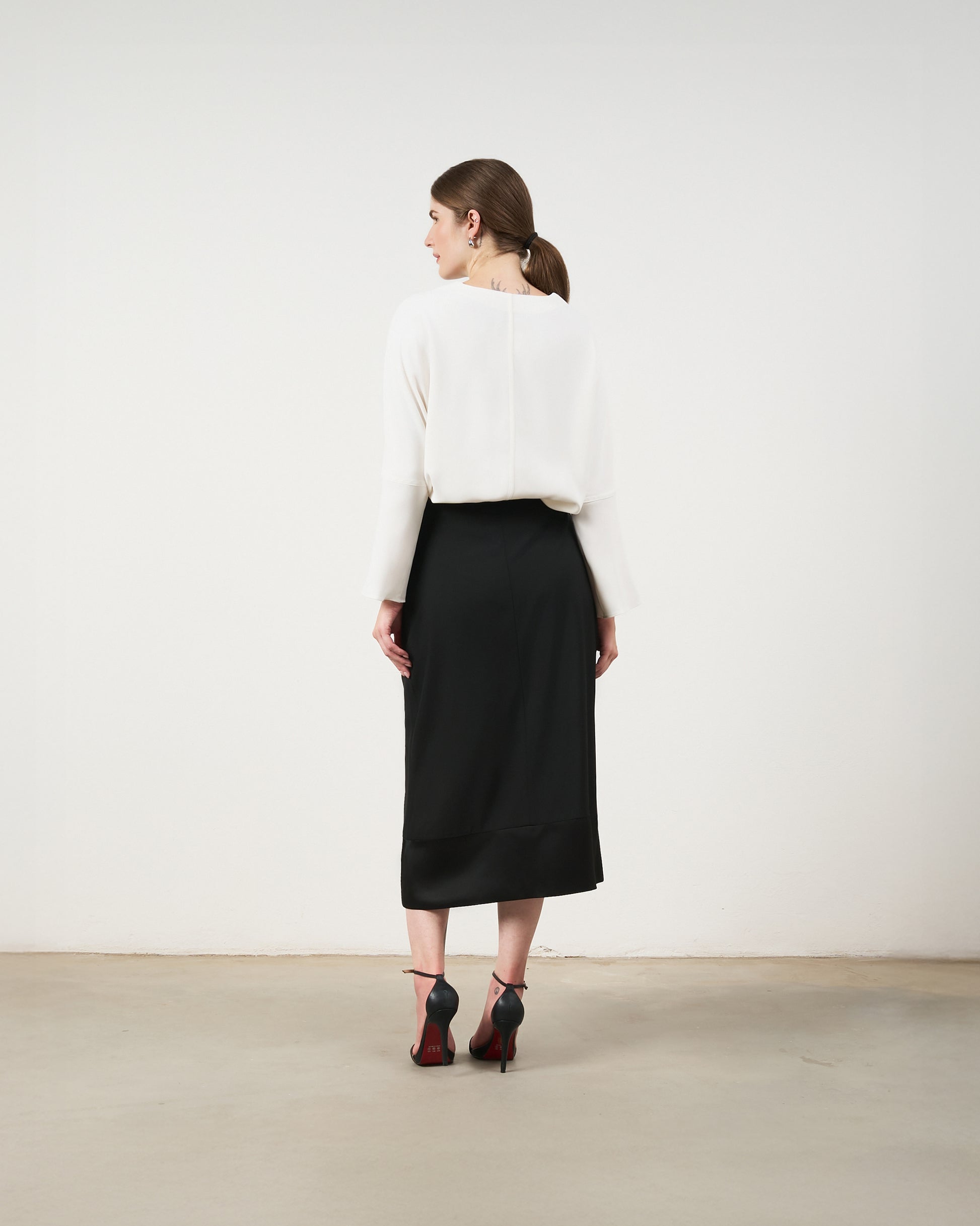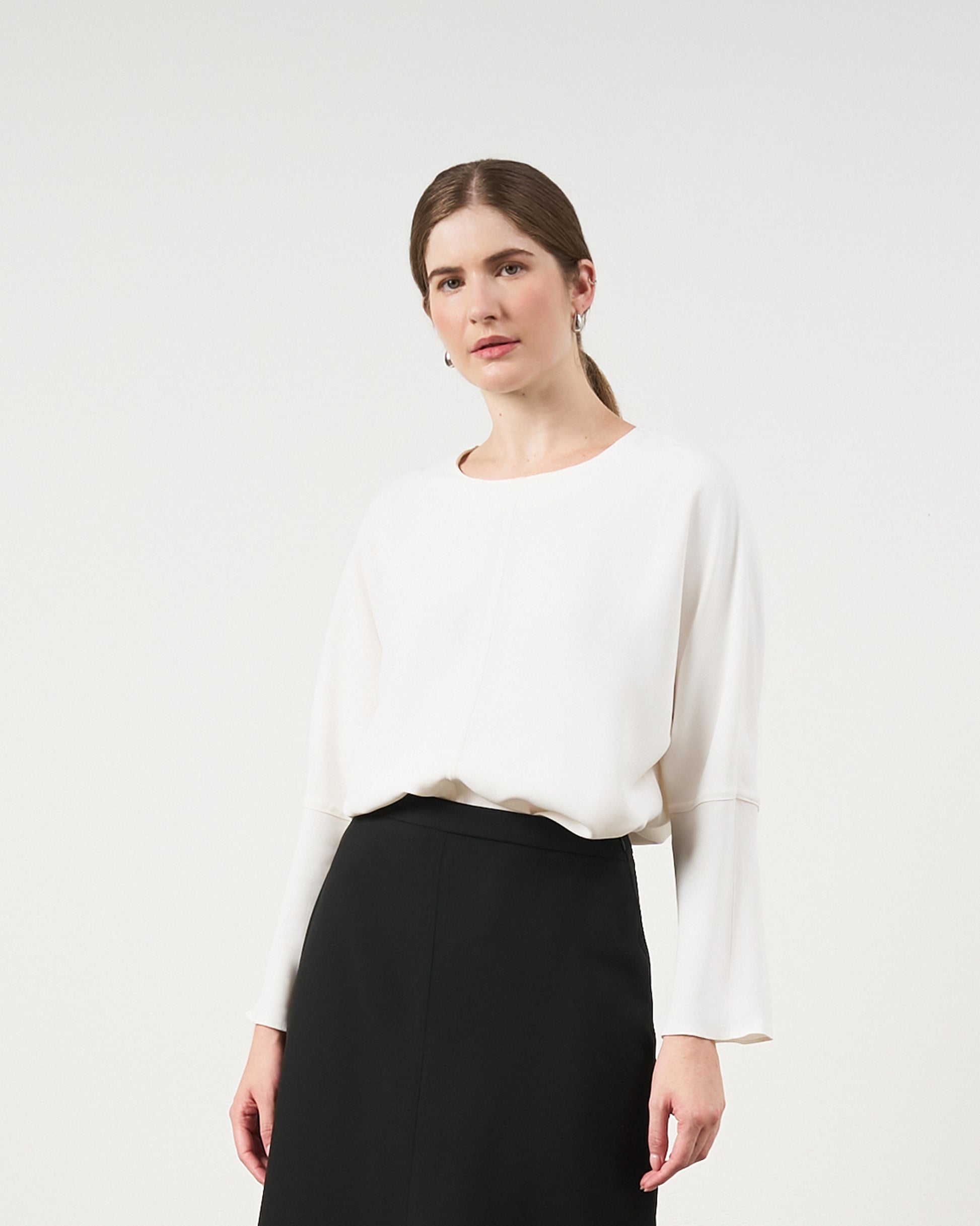 A Blusa Inglesa possui uma modelagem mais ampla, com manga longa e cava estilo morcego. Seu acabament é feito por meio de costuras inglesas no centro da frente e das costas, além do recorte com costura inglesa no meio das mangas.