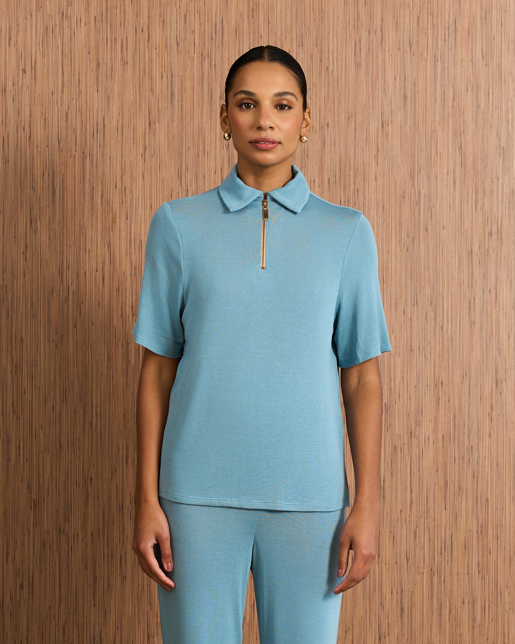 A Blusa Polo foi desenvolvida em malha super leve, de toque macio e caimento fluido, proporcionando conforto e movimento. Sua modelagem é reta e quadrada, com comprimento levemente alongado, na altura do quadril, proporcionando versatilidade e elegância. O destaque fica por conta da gola estilo camisa e do zíper metálico frontal, que confere um toque contemporâneo e sofisticado à peça.