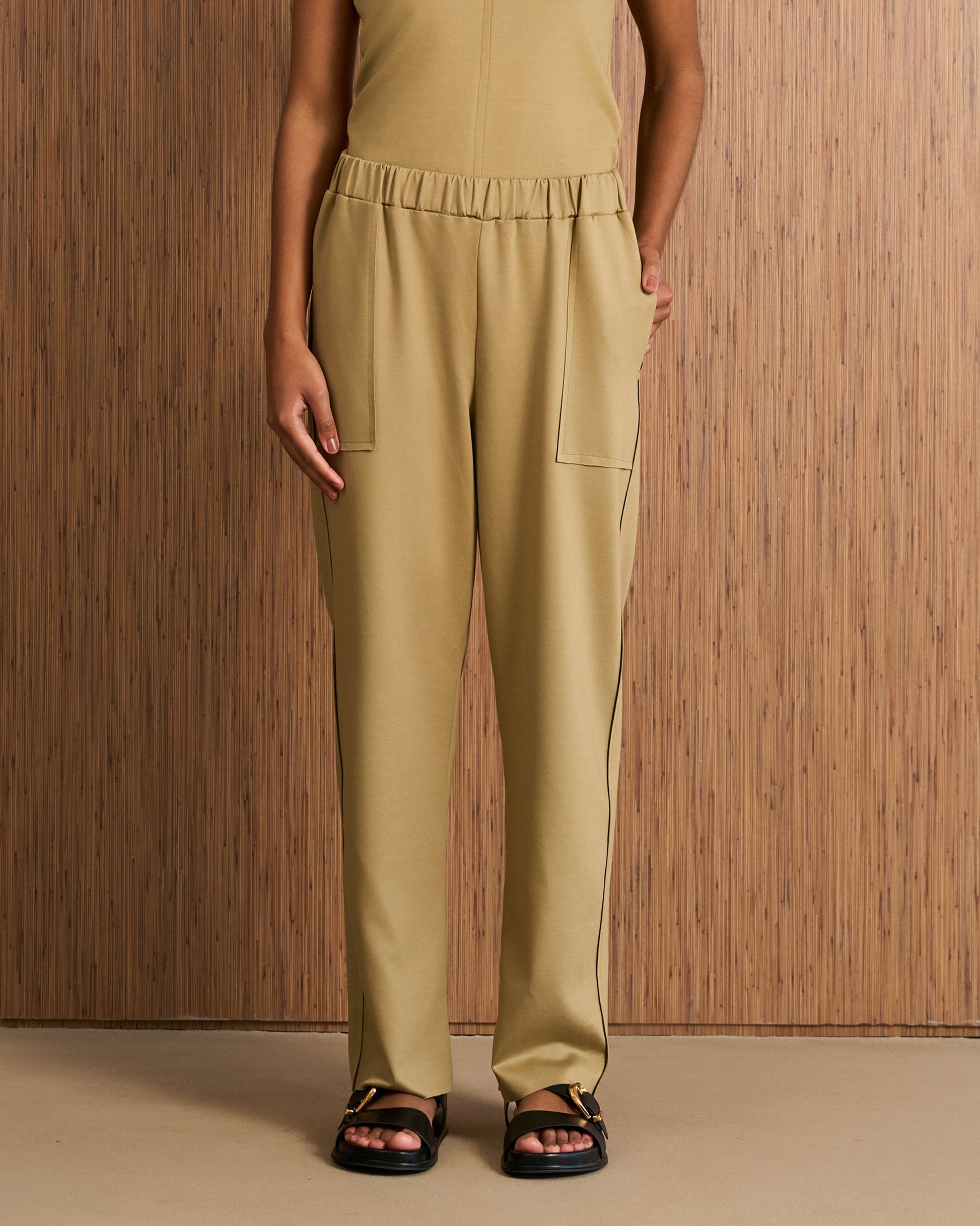 Calça Pijama confeccionada em tecido de malha estruturada e com a maciez do liocel. Possui modelagem reta, cós com elástico e bolsos aplicados na frente e costas. Seu acabamento é no fio do tecido.