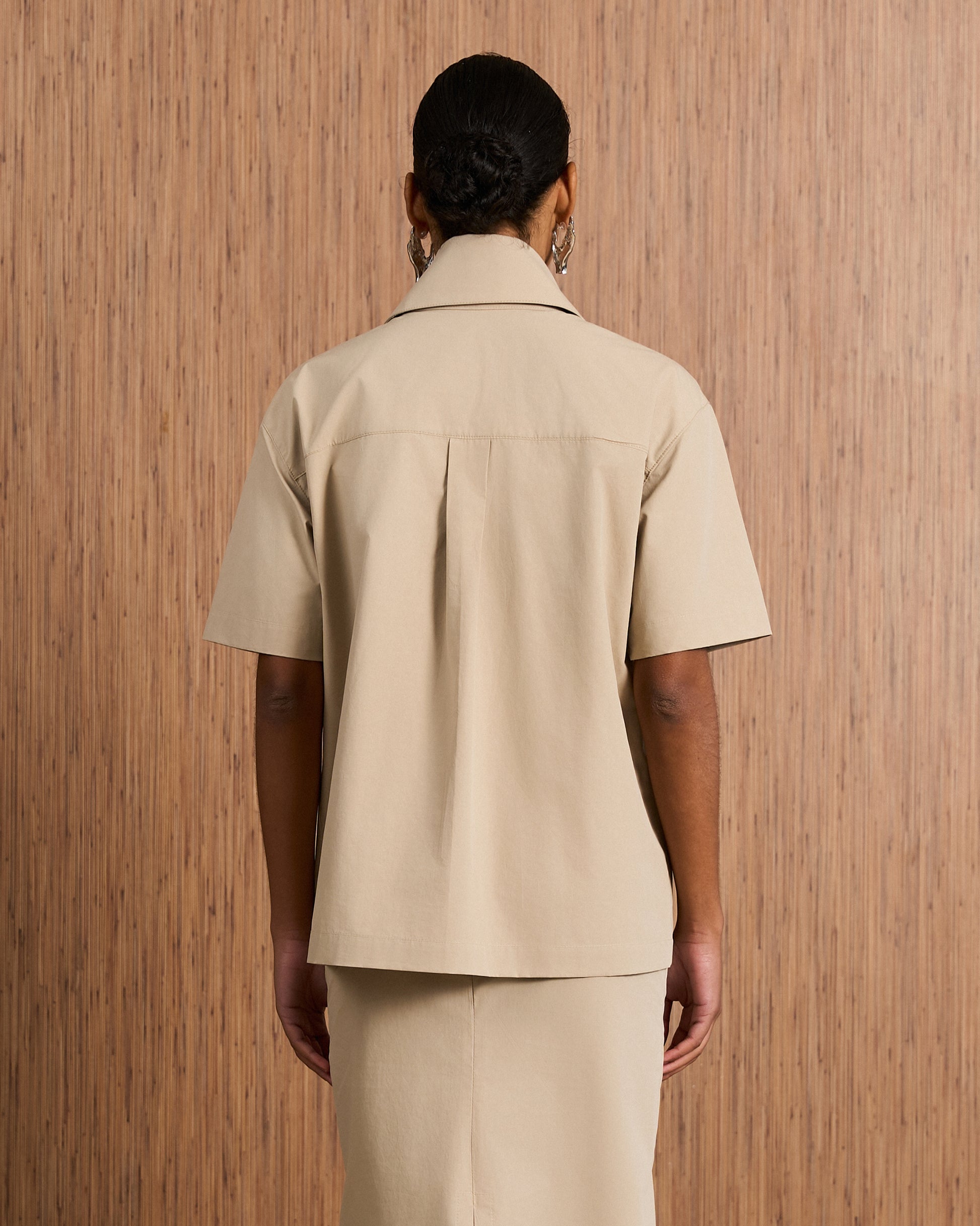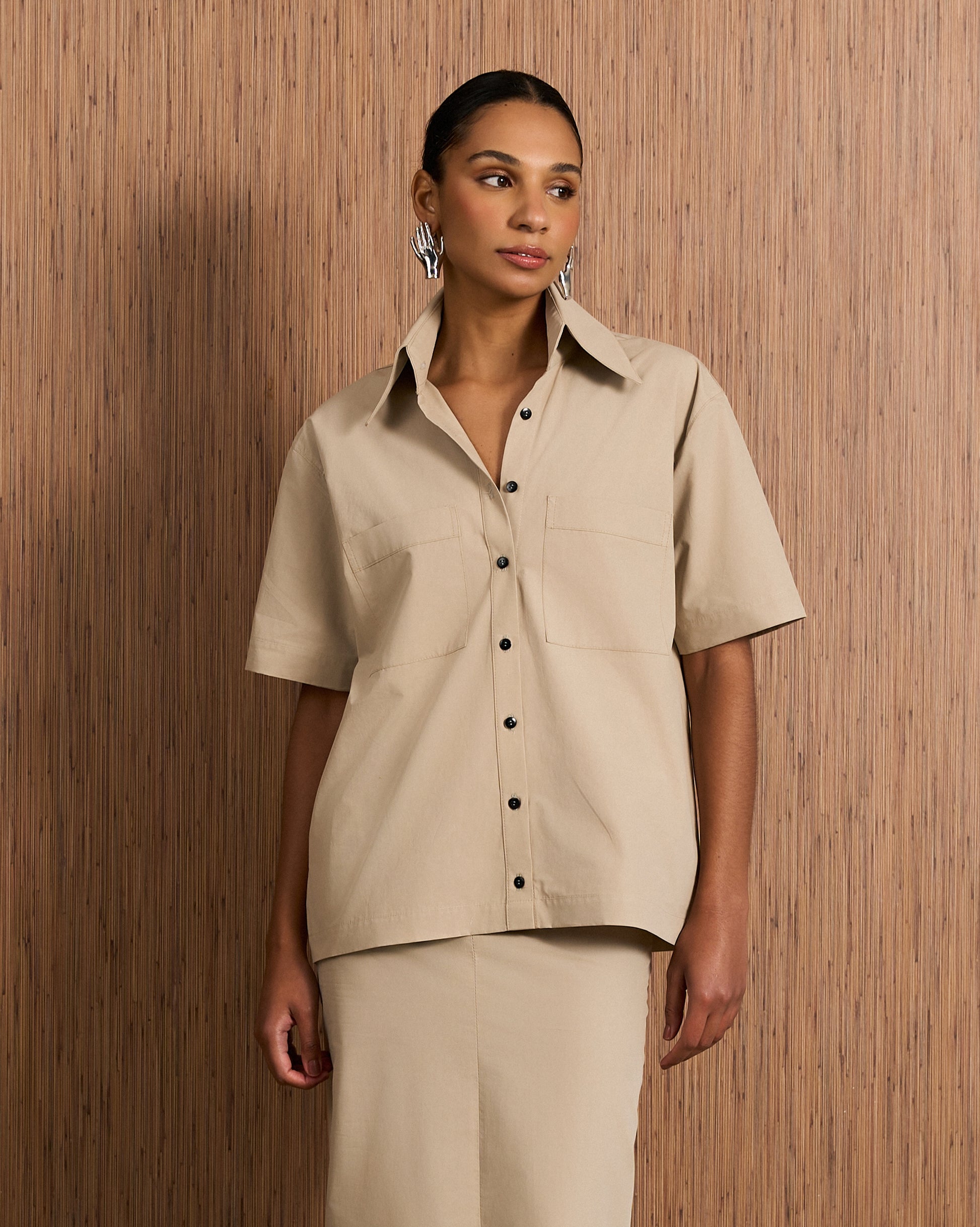 A Camisa Manga Curta é confeccionada em tecido de algodão, garantindo conforto e respirabilidade. Com modelagem ampla e quadrada. O design conta com gola estruturada em entretela de camisaria, botões contrastantes em preto e dois bolsos aplicados na parte frontal, que acrescentam praticidade e estilo. Nas costas, a pala com prega macho traz movimento e sofisticação ao visual. O comprimento na altura do quadril torna a peça perfeita para ser usada tanto por dentro quanto por fora da calça ou saia.