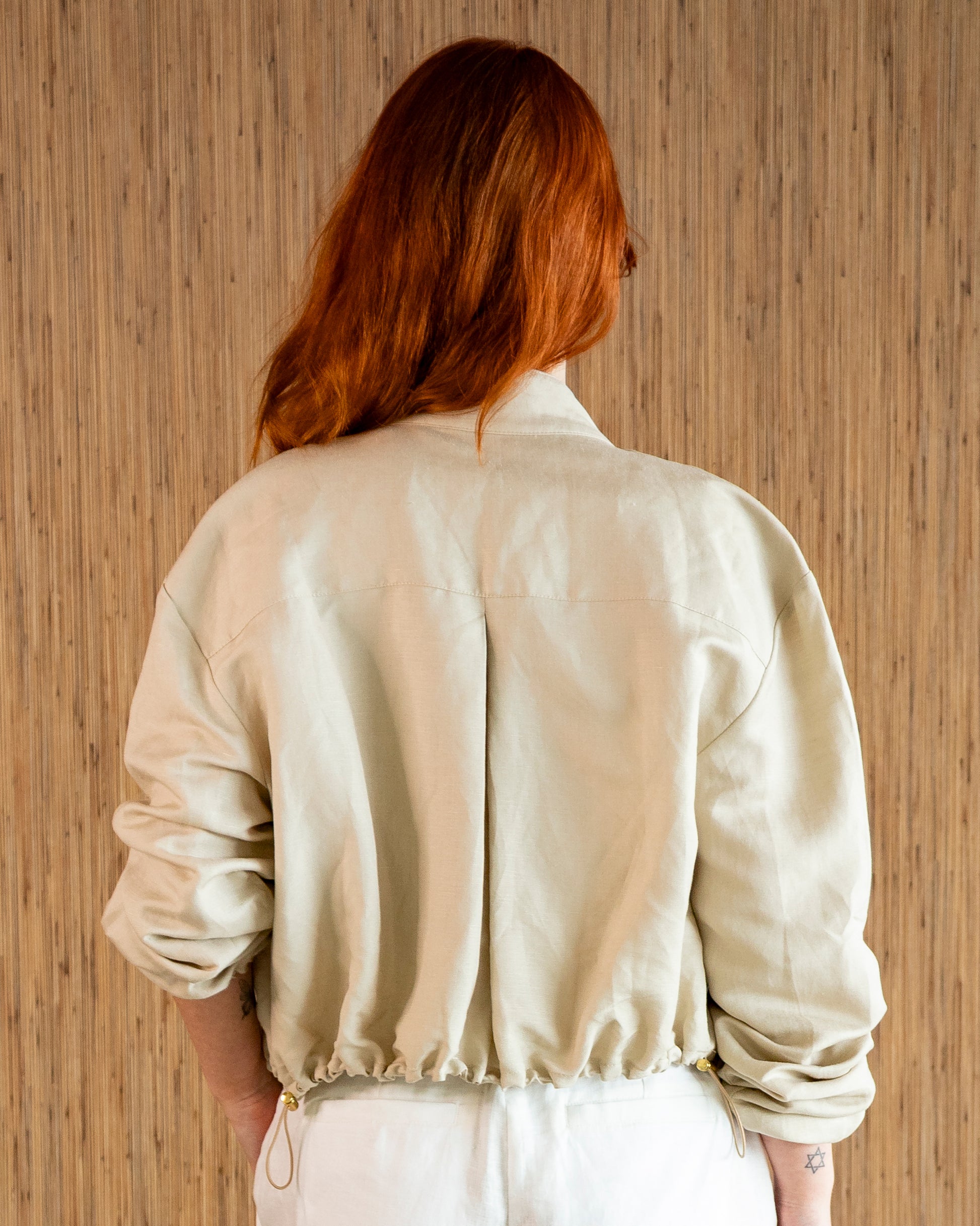 Casaco cropped em linho com gola levemente alta. Possui fechamento por botões com vista escondida e ajuste de elástico com regulagem nos punhos e na cintura. Desenvolvido para um caimento confortável e visual minimalista.