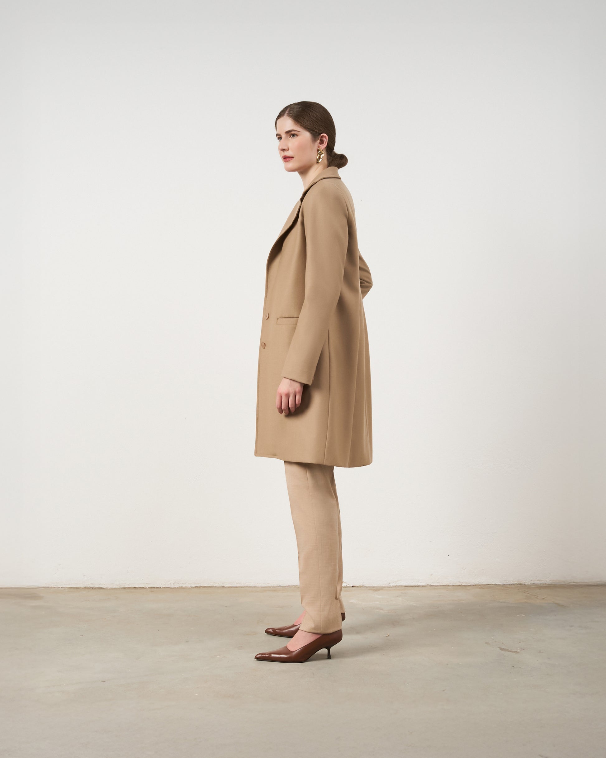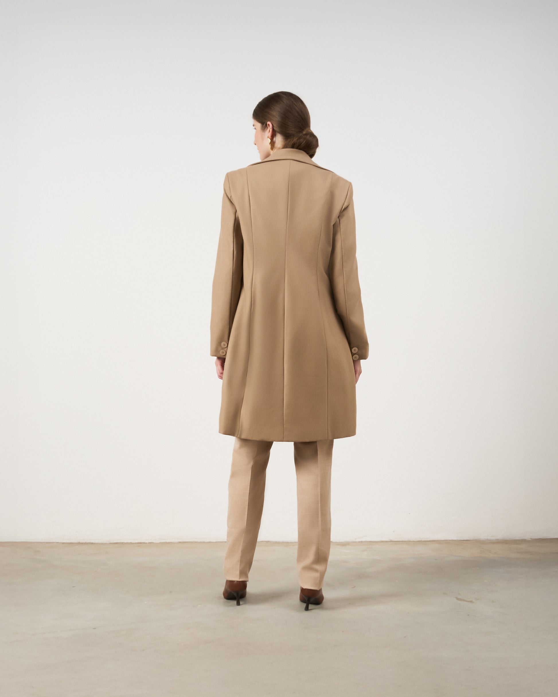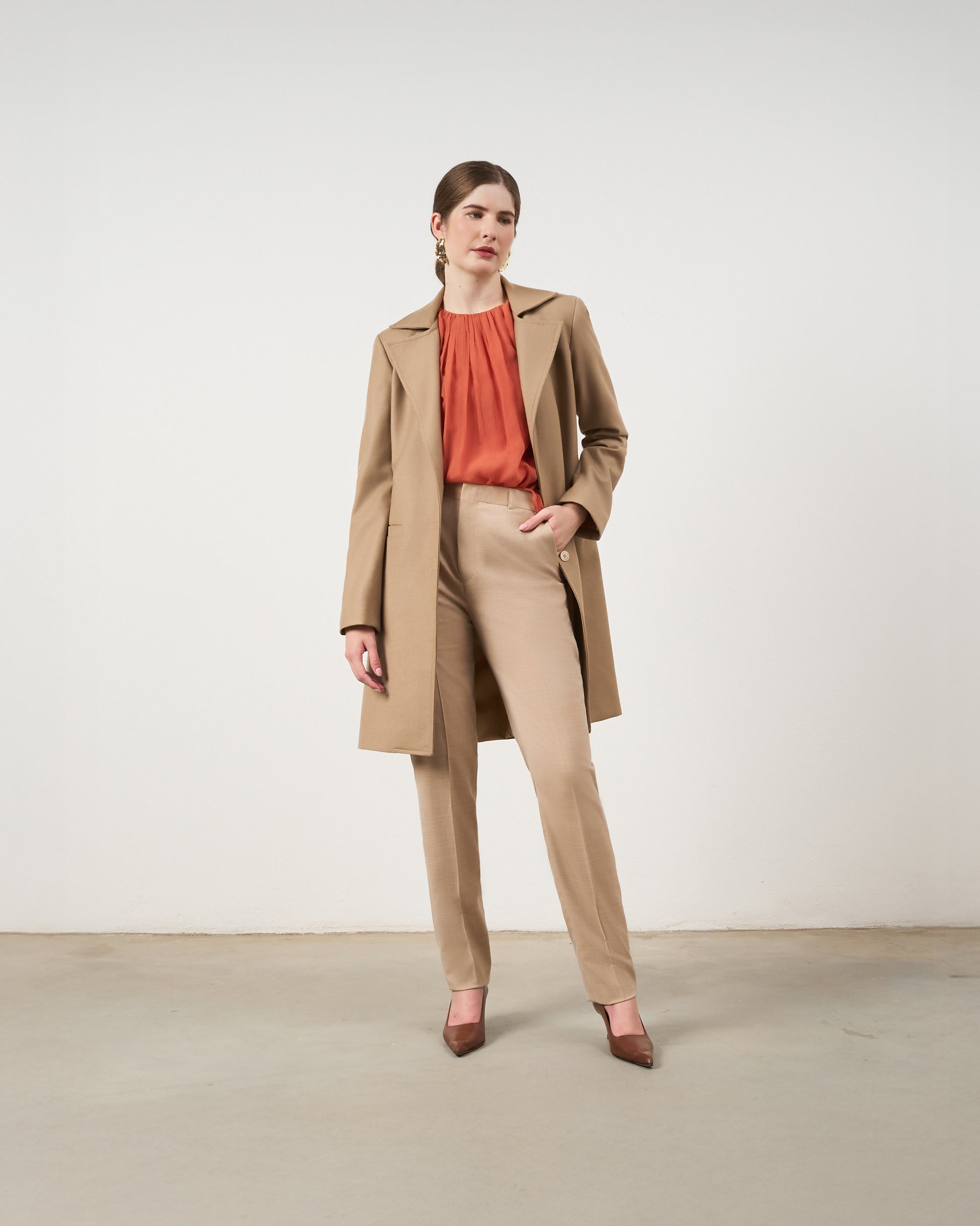 O Casaco Geórgia foi desenvolvido em lã, corte reto, caimento solto ao corpo, com gola entalhada, decote profundo, fechamento frontal com dois botões grandes, bolso verdadeiro e mangas longas.