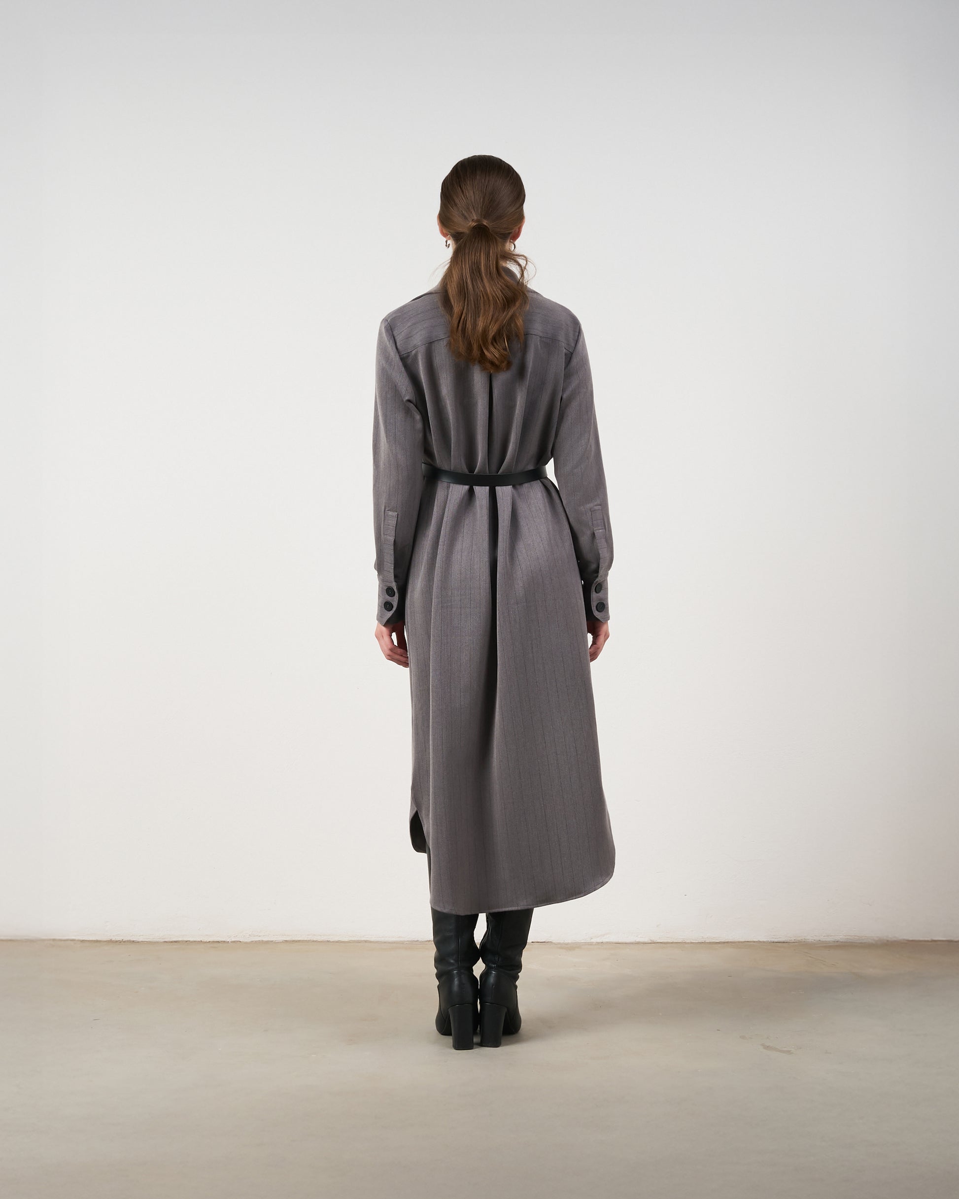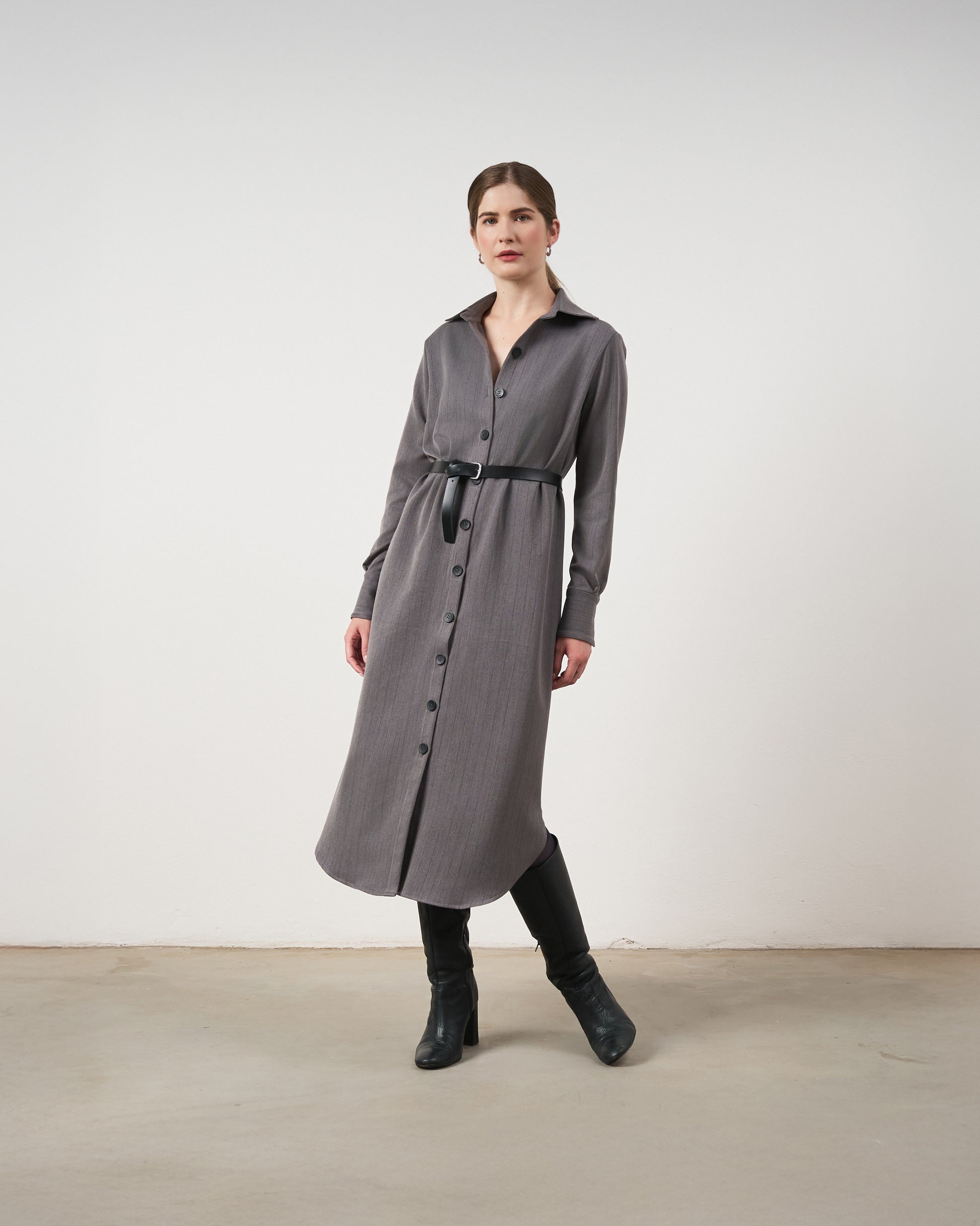 Vestido Chemisier confeccionado em tecido de alfaiataria possui modelagem ampla, gola de camisa e manga longa. Com fechamento frontal por botões, faixa/cinto do mesmo tecido para ajuste na cintura. Cinto em couro não acompanha a peça.