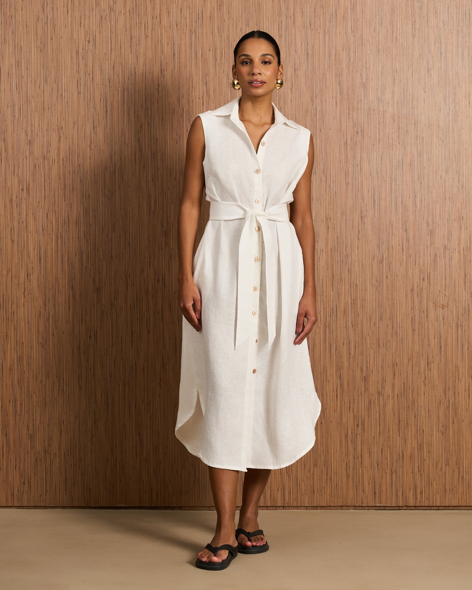 Vestido chemisier regata em linho com gola de camisa. Possui fechamento frontal por botões, cinto do mesmo tecido para ajuste na cintura e bolsos embutidos.