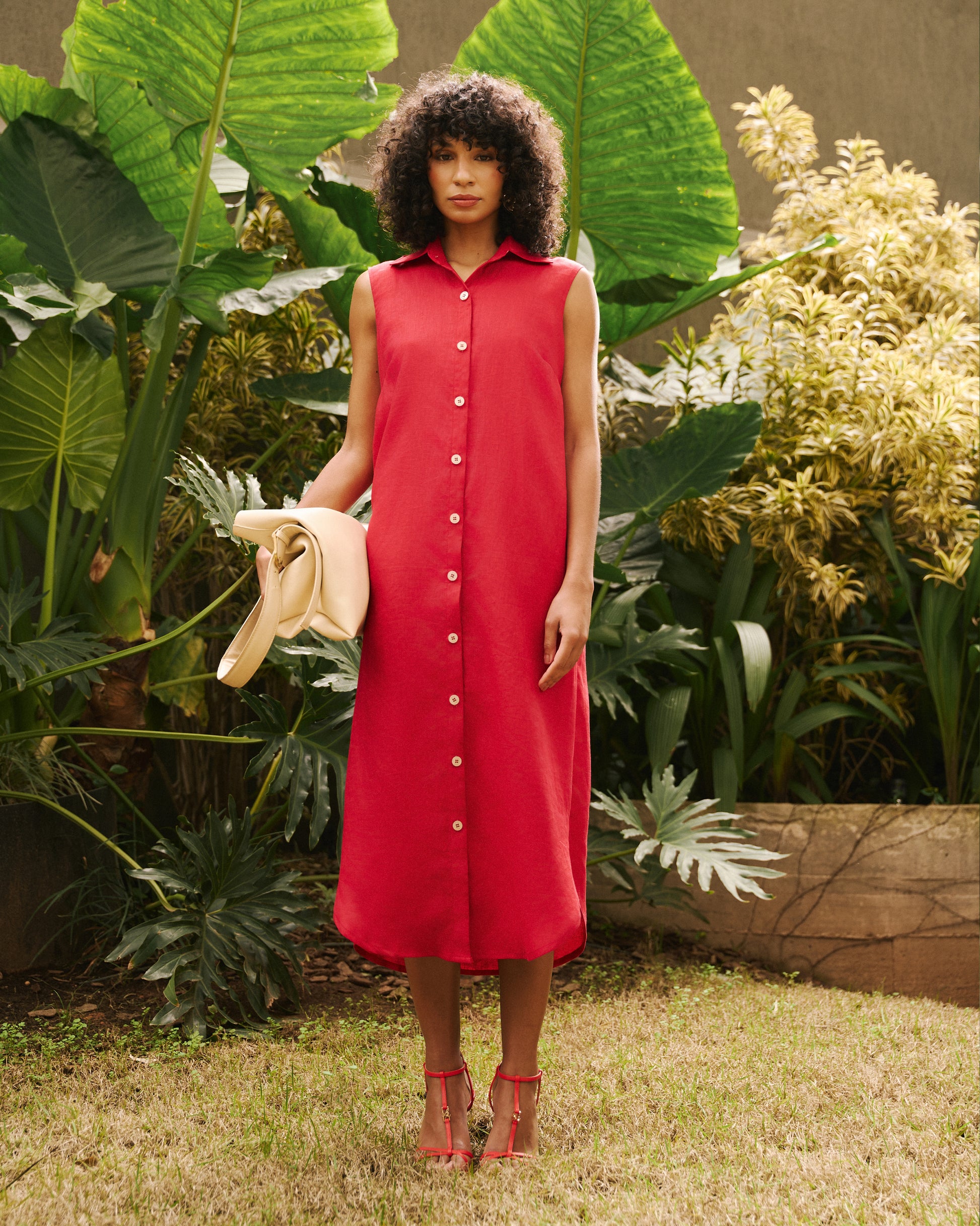 Vestido chemisier regata em linho com gola de camisa. Possui fechamento frontal por botões, cinto do mesmo tecido para ajuste na cintura e bolsos embutidos.