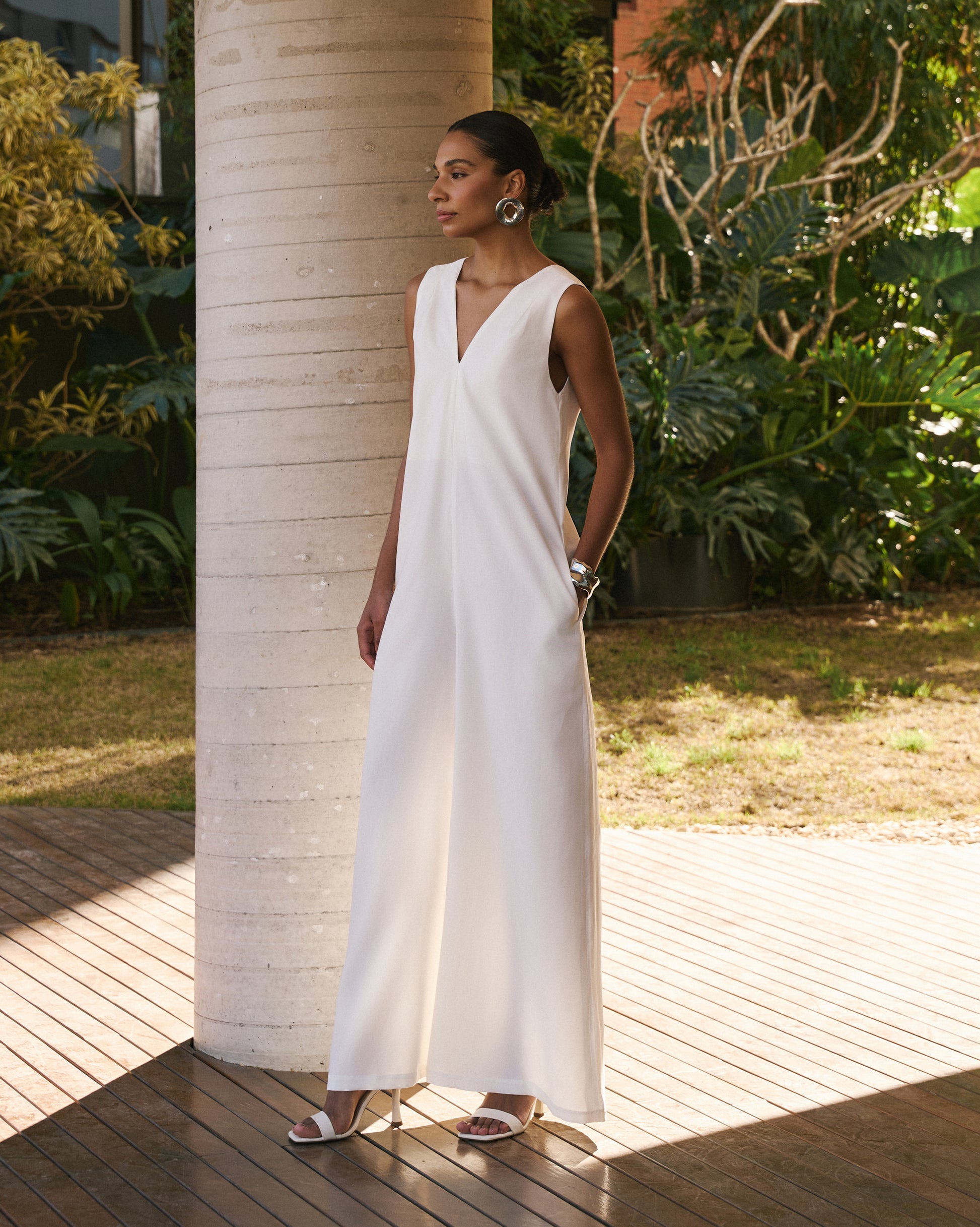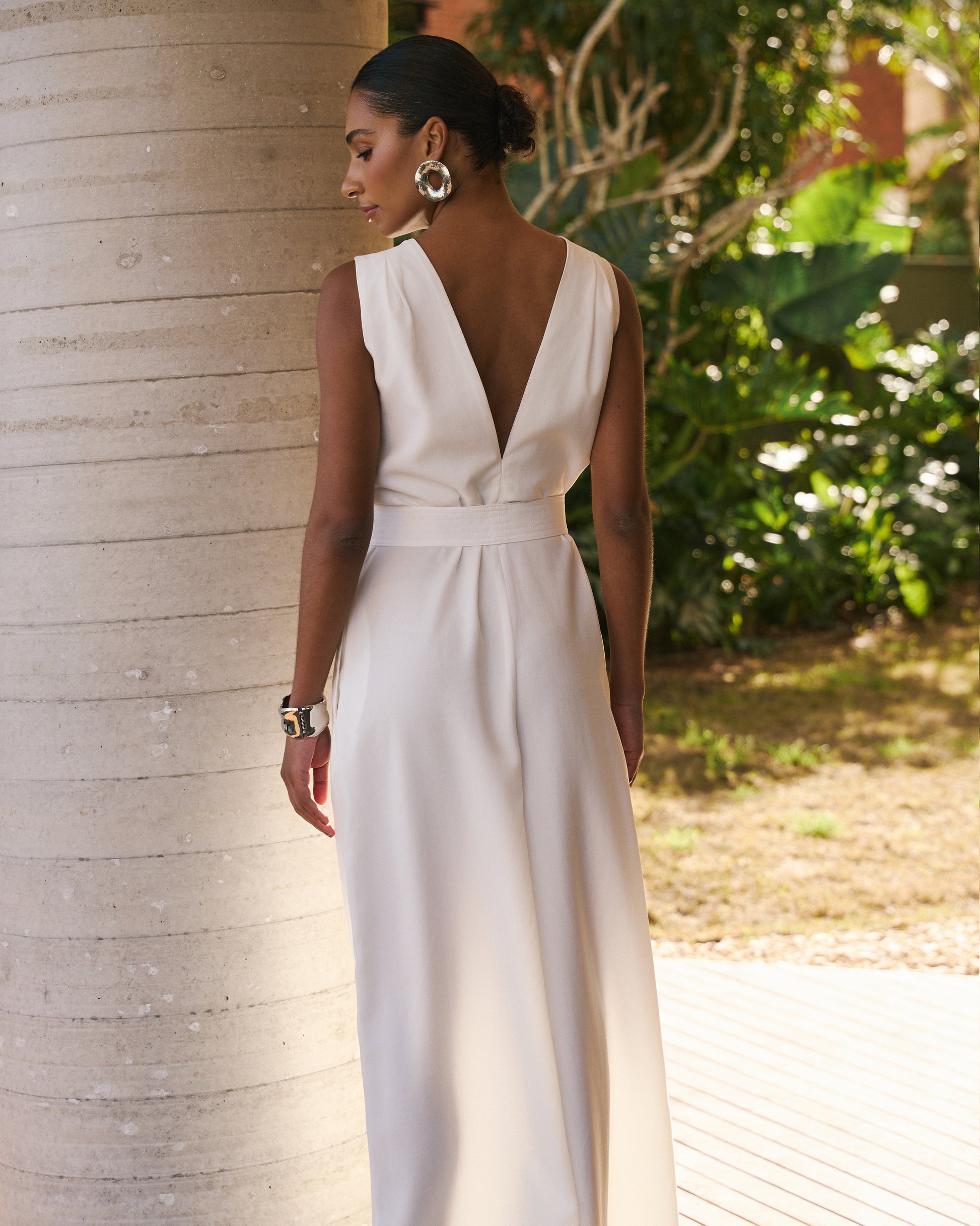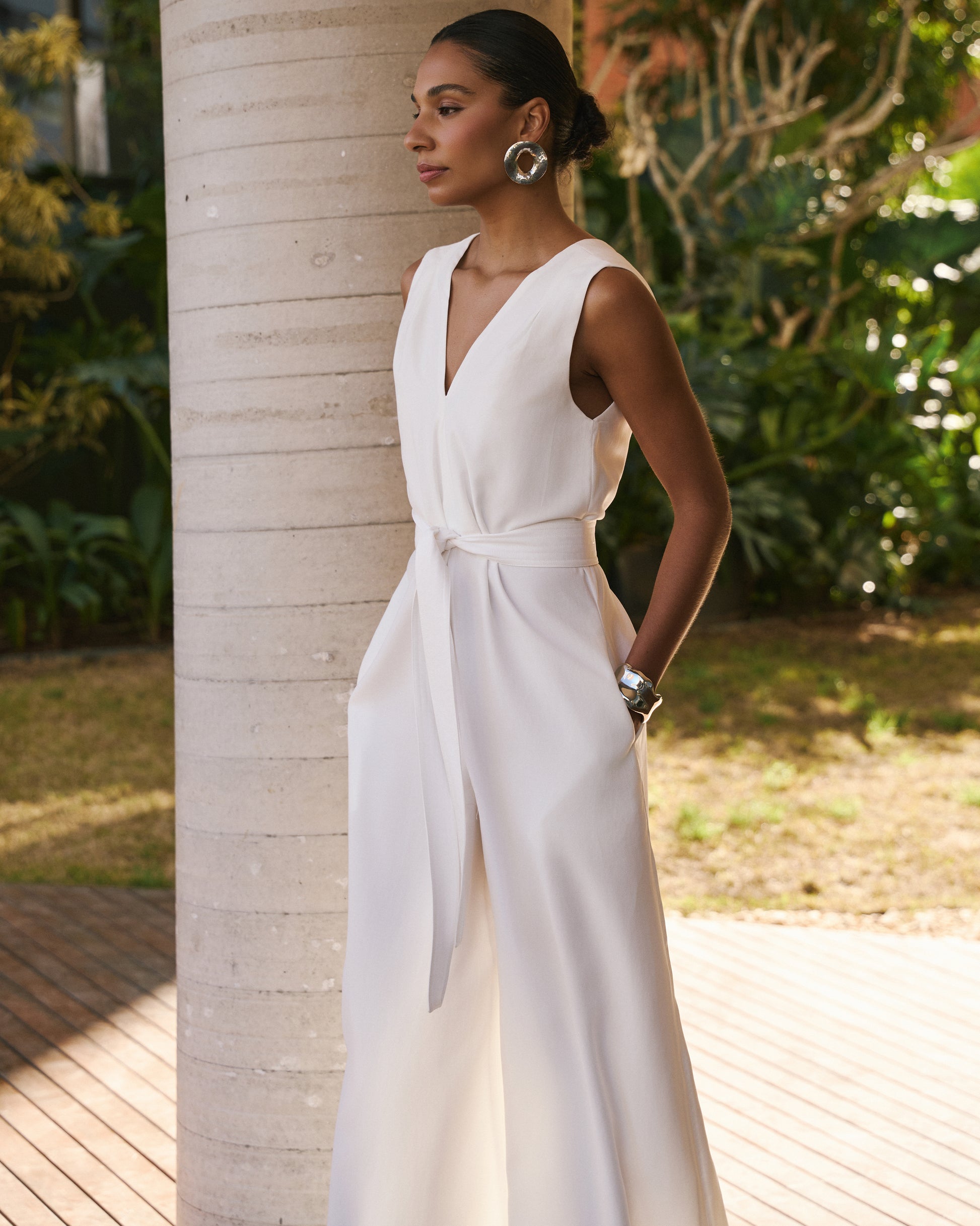 Macacão com decote em V na frente e nas costas. Possui bolsos embutidos e cinto do mesmo tecido para ajuste na cintura. A modelagem pantalona oferece liberdade de movimento e caimento fluido.