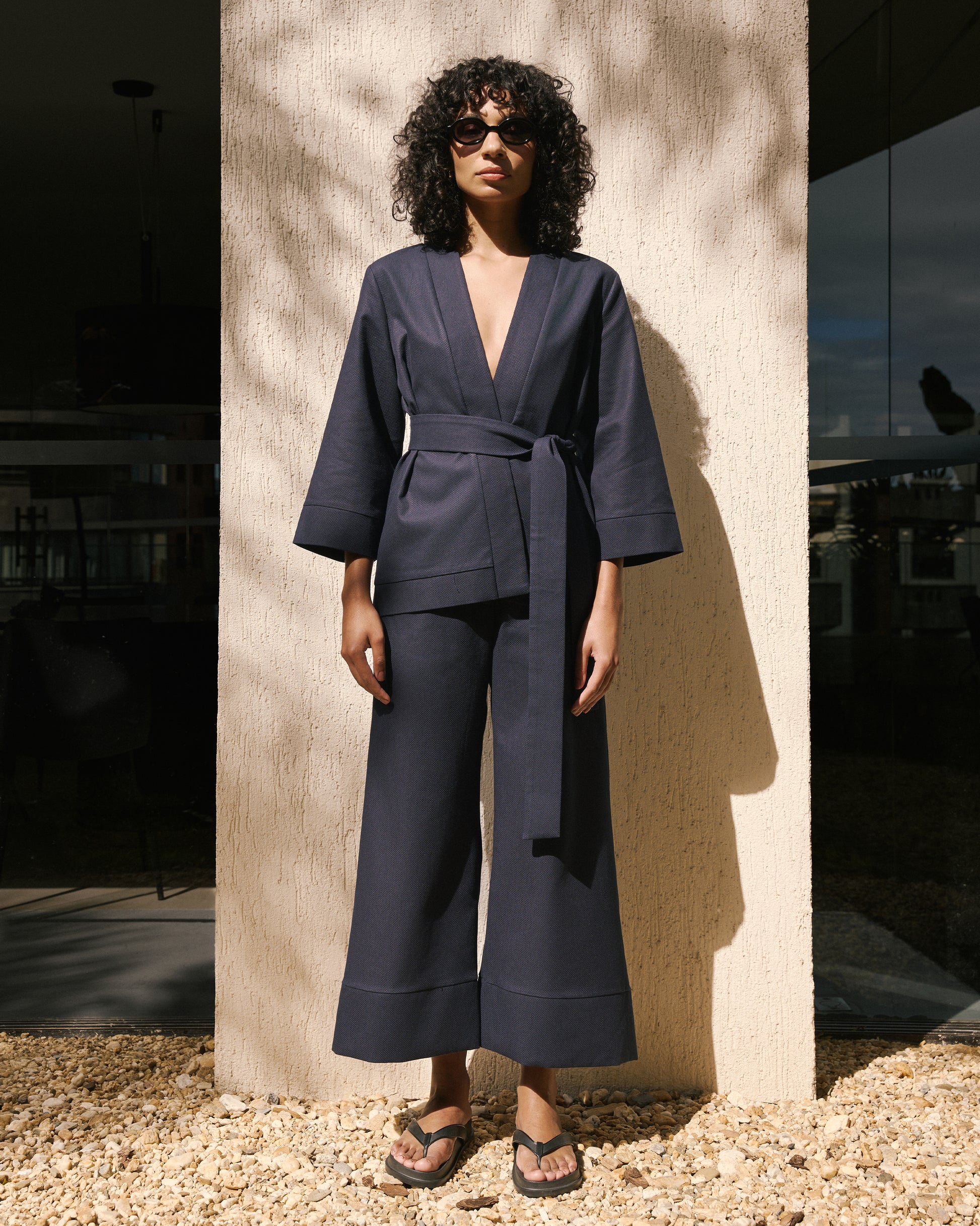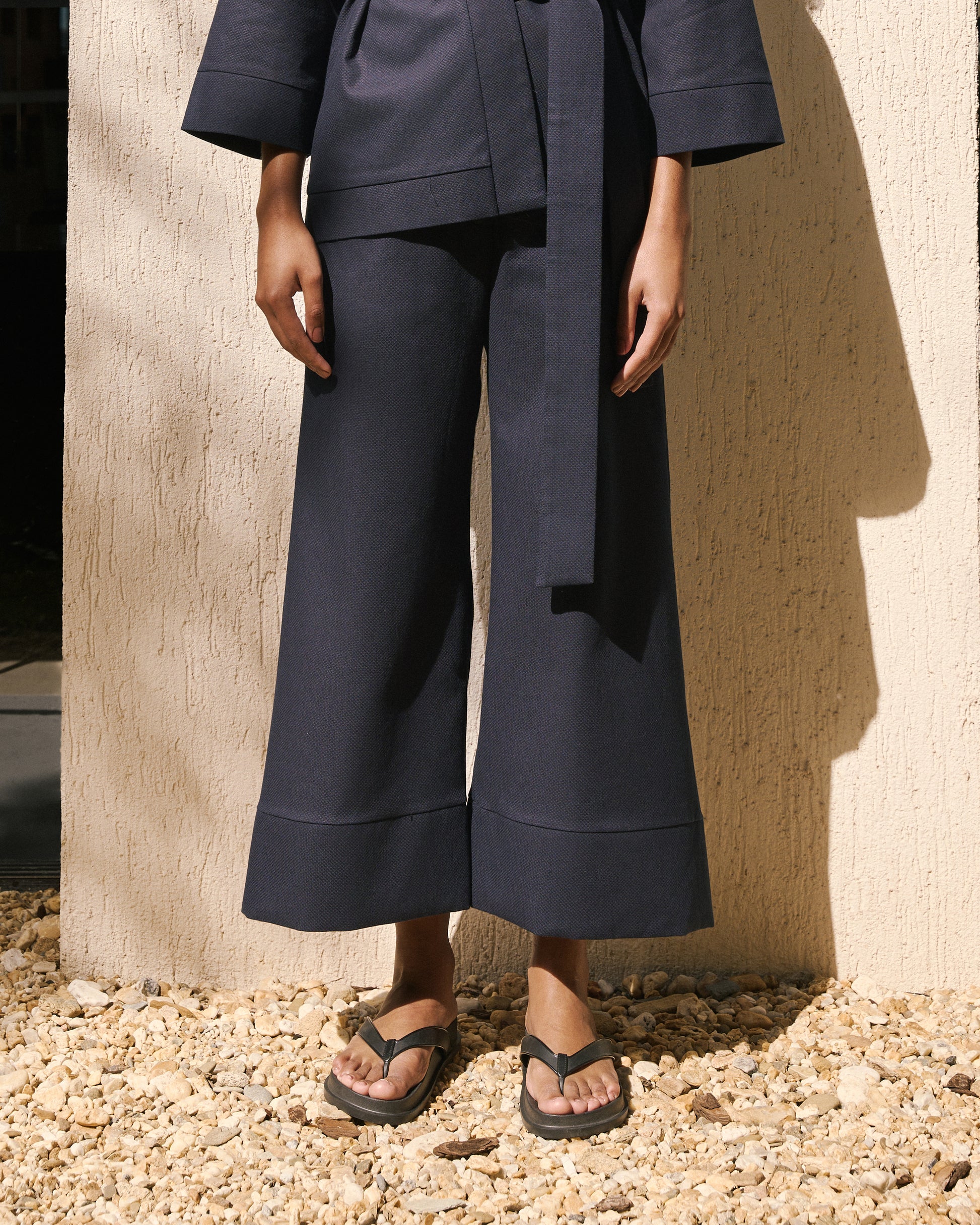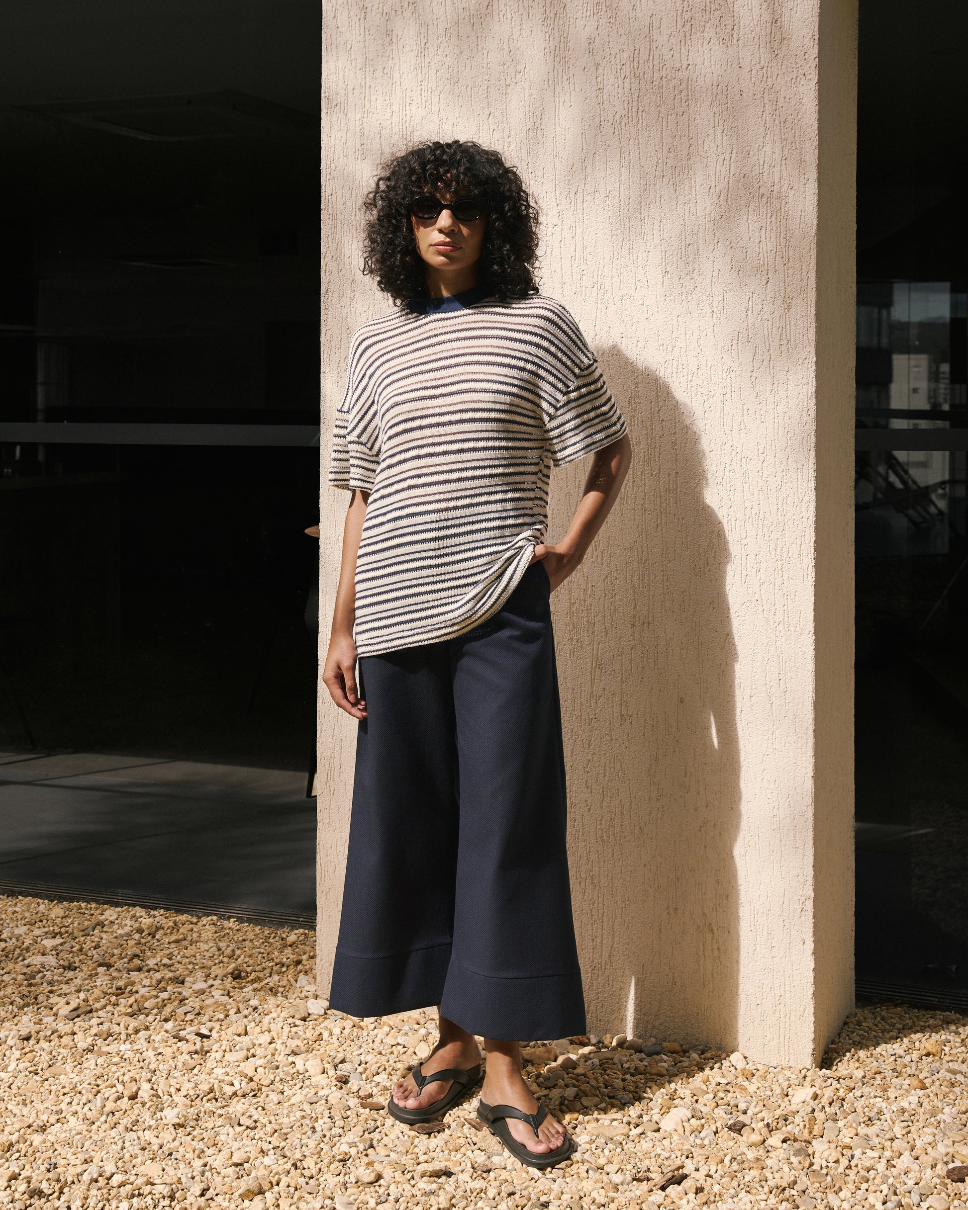 A calça Pantacourt com Barrado, desenvolvida em tecido de algodão piquet com leve textura. O cós de alfaiataria é complementado com elástico no centro das costas, oferecendo maior ajuste ao corpo e conforto. Possui modelagem ampla, trazendo conforto e estilo com o seu barrado aplicado.
