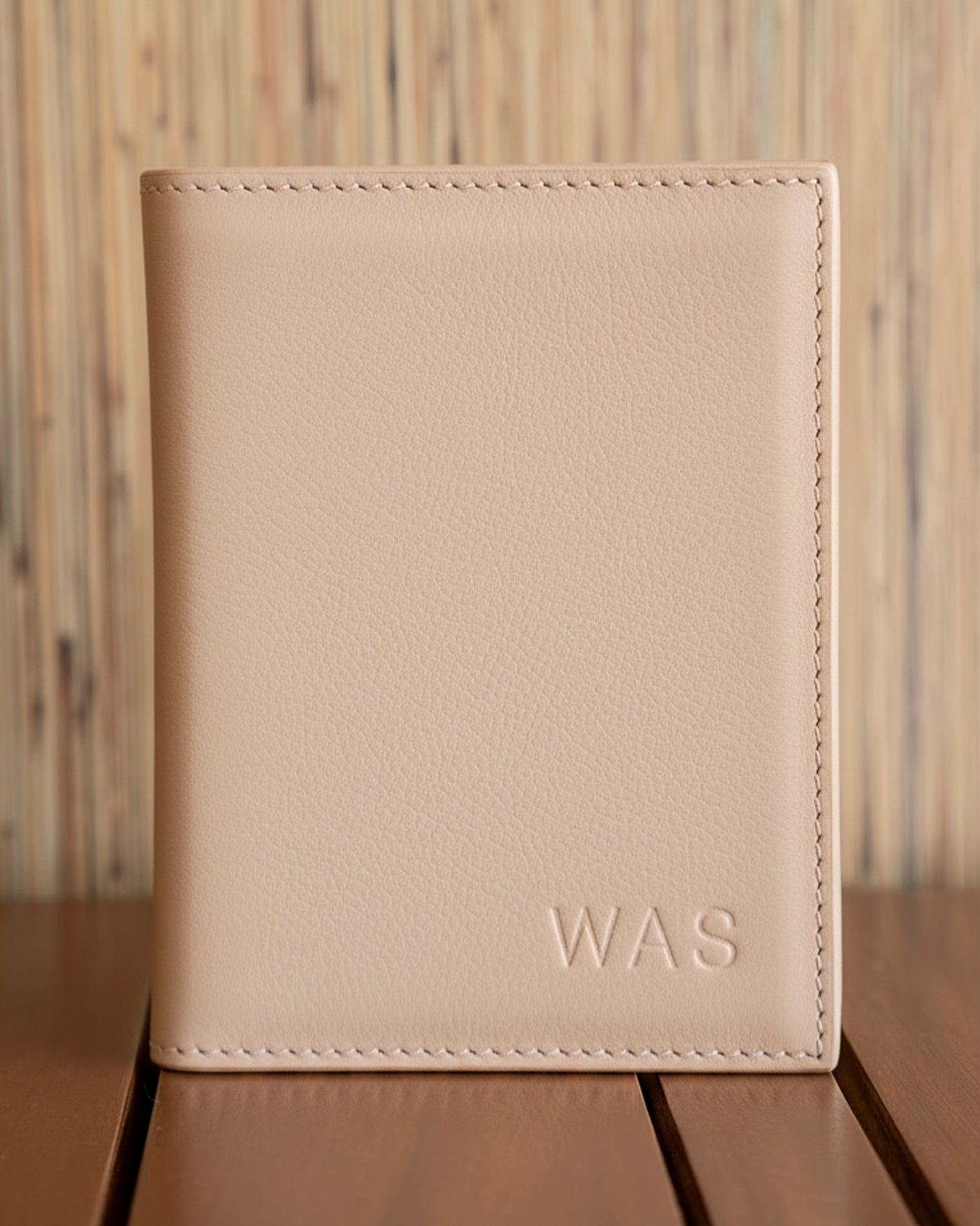 Porta passaporte em couro bege.