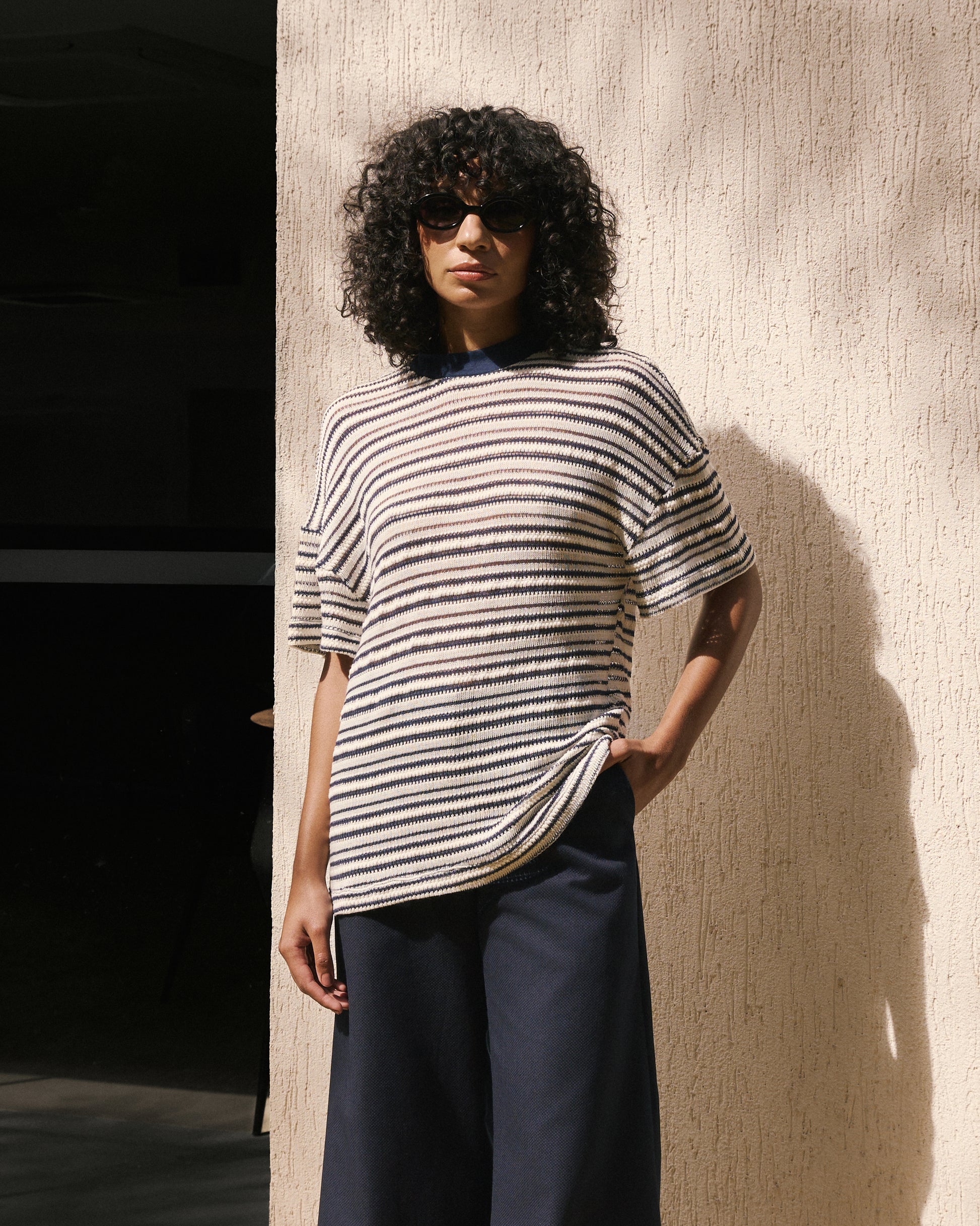 T-Shirt Retrô confeccionada em tricot de viscose e algodão com ponto vazado. Possui modelagem ampla, manga curta com cava deslocada e comprimento alongado. Decote redondo com acabamento em ribana de algodão.