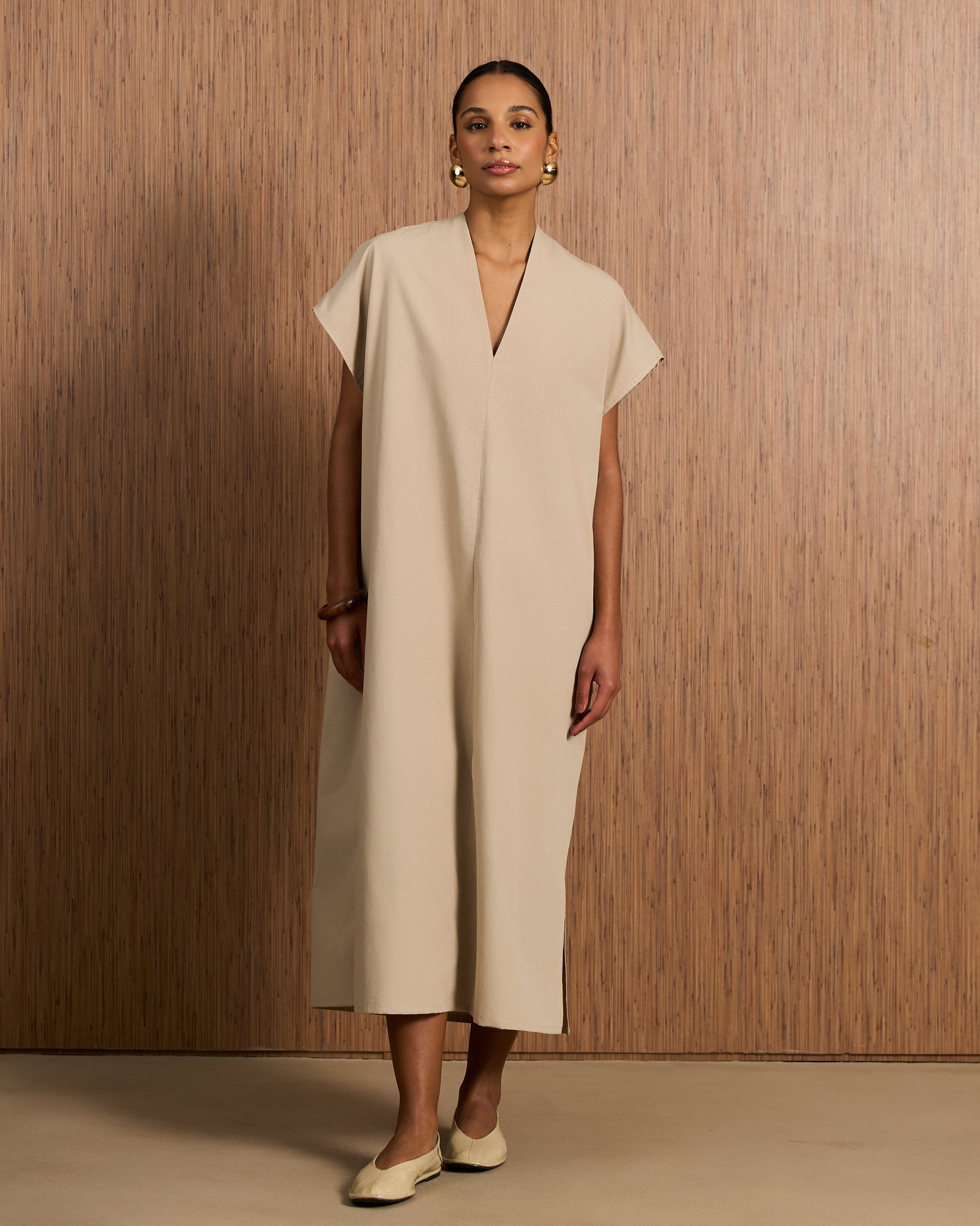 Vestido Hera desenvolvido em tecido de algodão papeludo, garante conforto e estrutura. De modelagem ampla, com mangas curtas sem cava, proporcionando um visual moderno. A peça possui decote V e comprimento midi, além de recortes no centro frente e costas e fenda nas laterais.