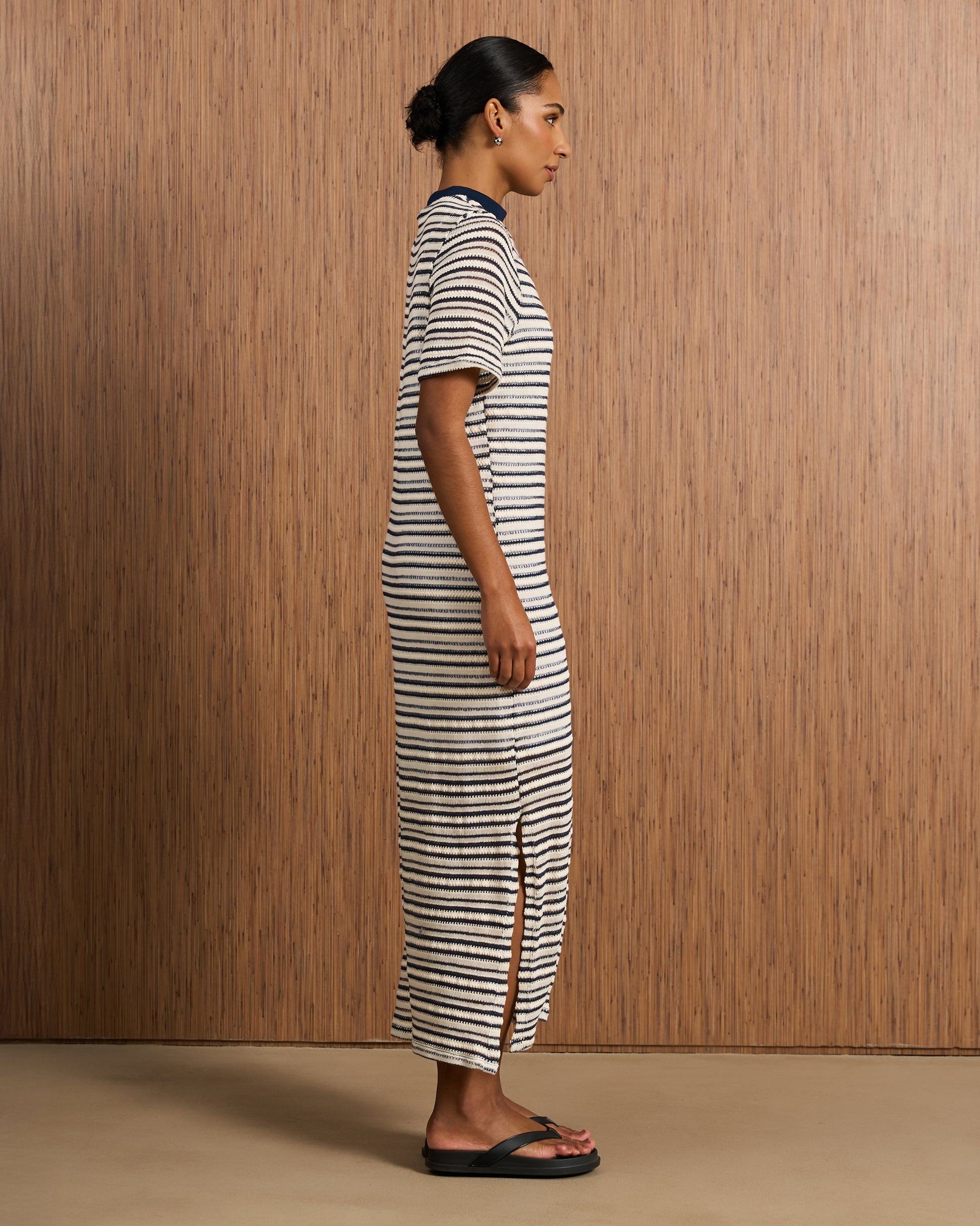 O Vestido Retrô é confeccionado em malha trabalhada vazada, que confere textura e leve transparência ao visual. Para garantir conforto e praticidade, a peça acompanha uma anágua em tecido de viscose, proporcionando o forro ideal sem comprometer a leveza do modelo. Com modelagem reta e leve abertura na barra, o vestido apresenta listras horizontais em padronagem clássica, gola em ribana e mangas curtas, que reforçam a inspiração vintage. As fendas laterais completam o design com movimento e um toque contemporâneo, tornando-o perfeito para composições casuais e cheias de estilo.